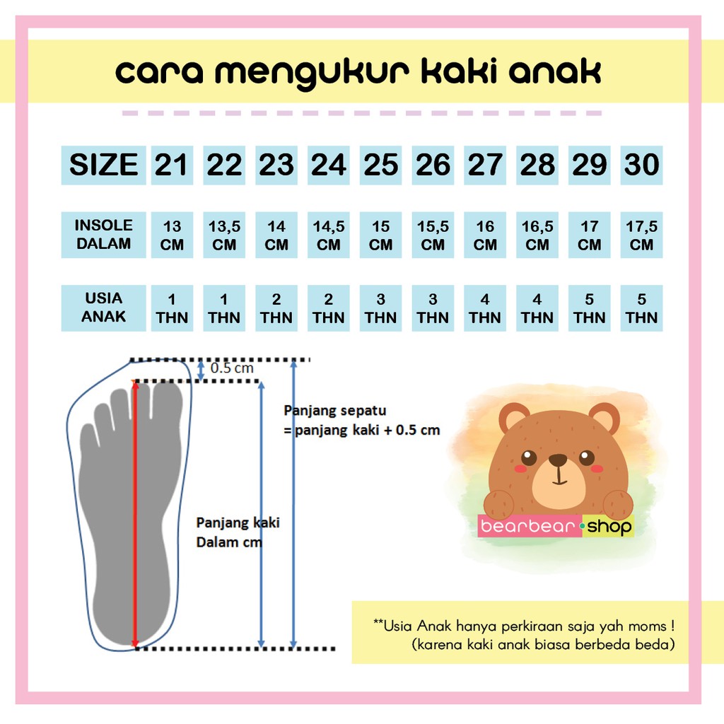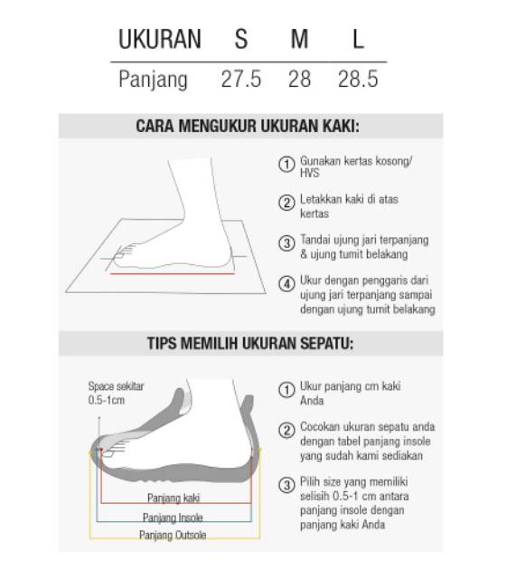 Daftar ukuran umum sepatu yang biasa digunakan antara lain size 36: Tabel kaki ke sentimeter · 1 ft, 30.48 cm · 2 ft, 60.96 cm · 3 ft, 91.44 cm · 4 ft, 121.92 cm · 5 ft, 152.40 cm · 6 ft, 182.88 cm · 7 ft, 213.36 cm · 8 ft, 243.84 cm. Namun, ukuran tersebut biasa dibulatkan . 22.80, 23.10, 23.50, 23.80, 24.10, 24.50, 24.80, 25.10, 25.40, 25.70, 26.00, 26.70, 27.30, 27.90, 28.60, 29.20. Ketik jumlah sentimeter yang ingin anda konversi dalam kotak teks, untuk melihat hasilnya di tabel.